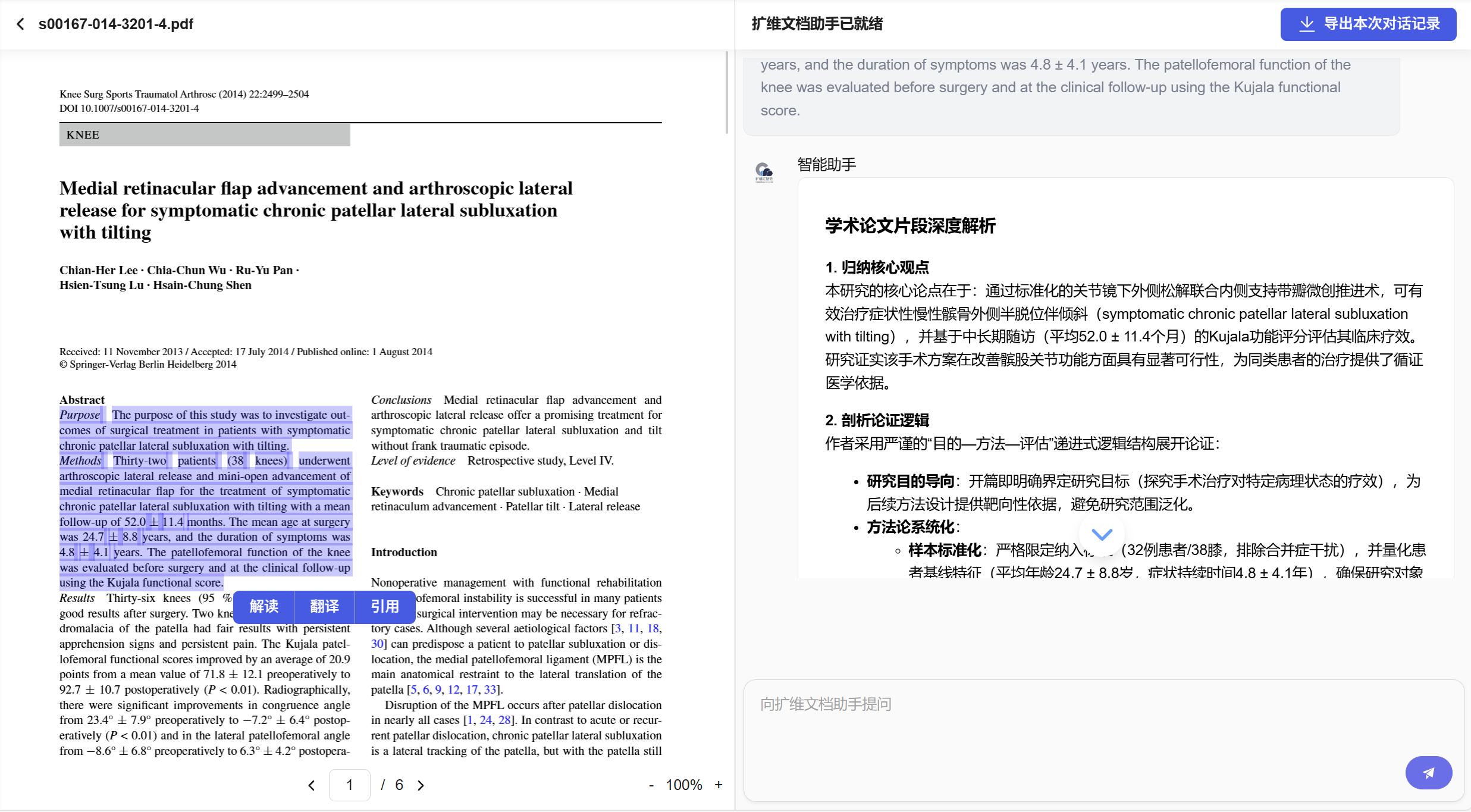 扩维汇智云文档智读功能支持多格式文件在线预览与交互式问答,可实现划词解读、专业翻译、内容总结,高效挖掘文档核心信息。