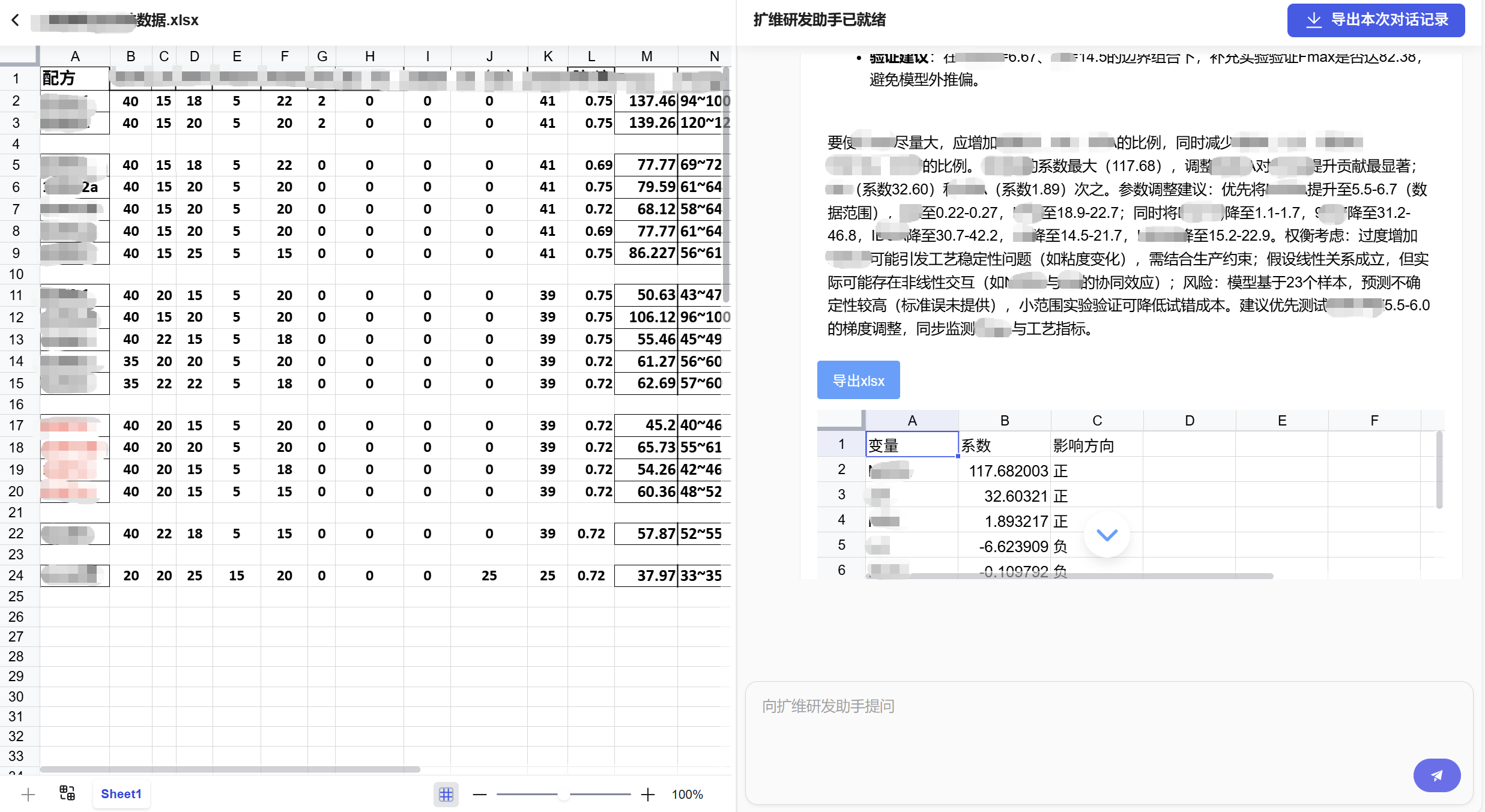扩维汇智云实验数据分析功能支持多格式实验数据上传,通过 AI + 专业数学工具实现交互式问答、特征挖掘与变量优化,精准输出满足条件的分析结果与示例数据。
